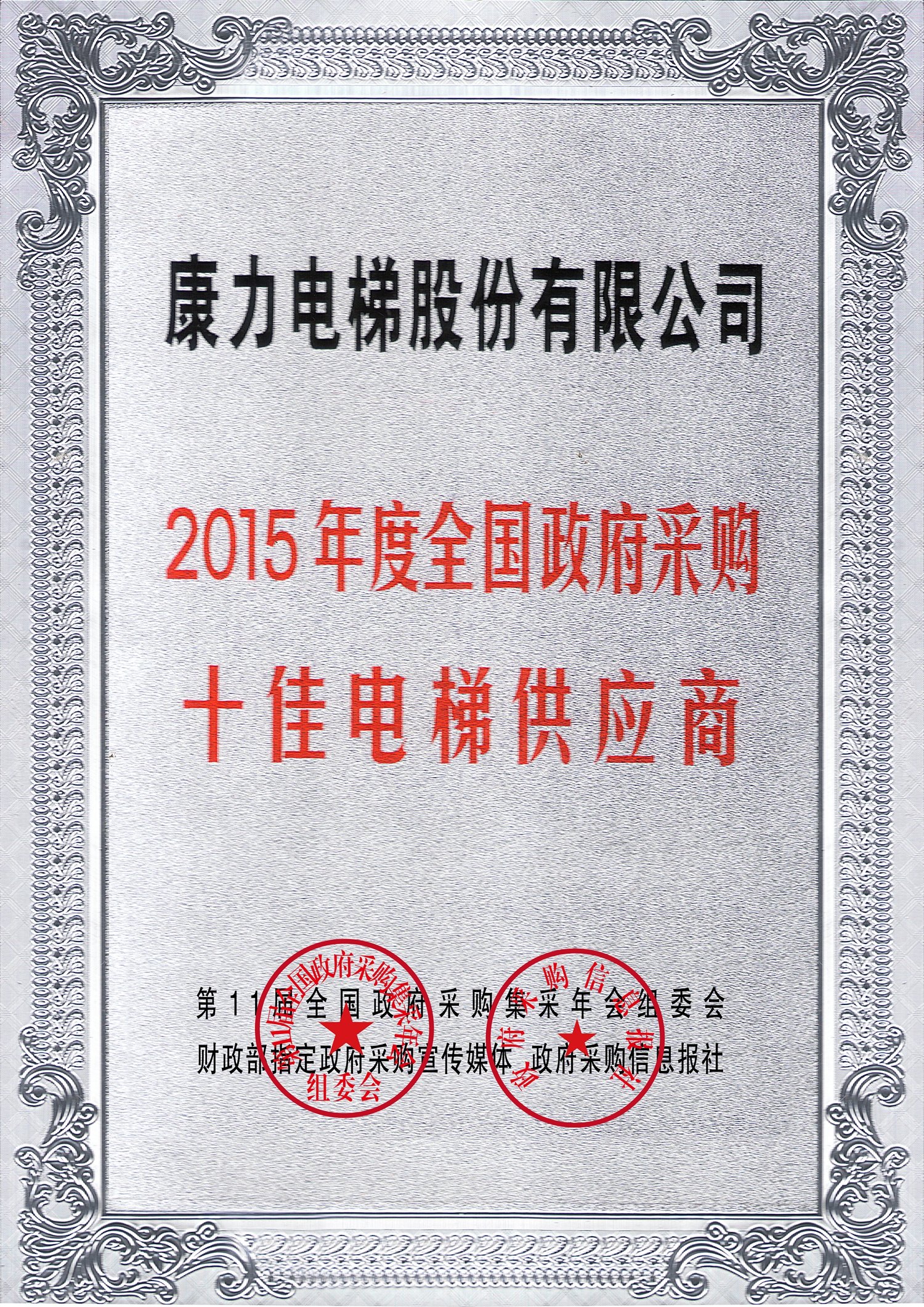公司荣获“2015年度全国政府采购十佳电梯供应商”