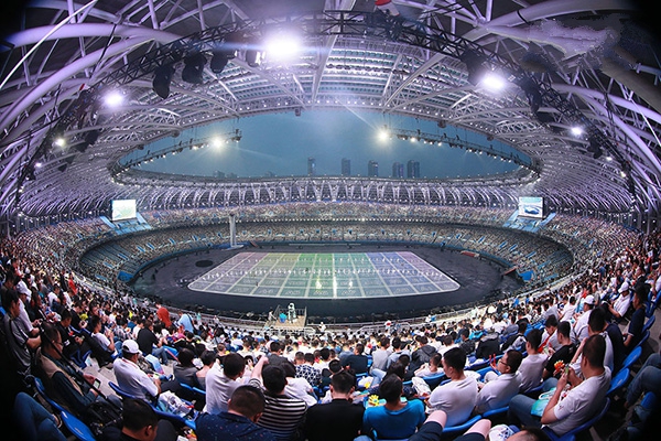 本届天津全运会开幕式的一大亮点,就是全程应用全屏激光投影,并与现场动态表演有机结合,同时与场外高大建筑灯光秀的合成,成就一场美轮美奂的声光电视觉盛宴。