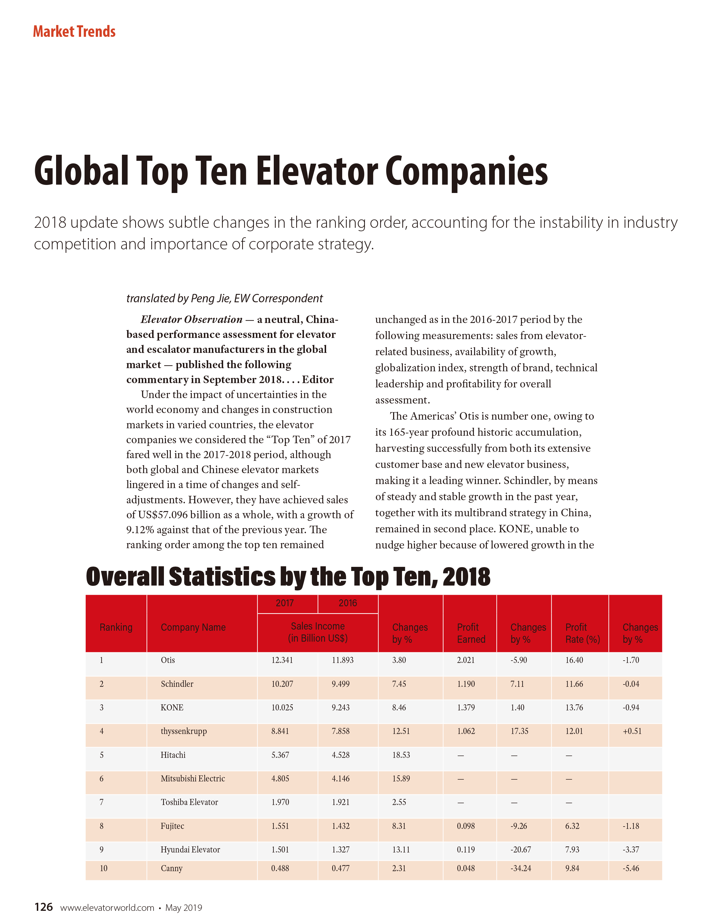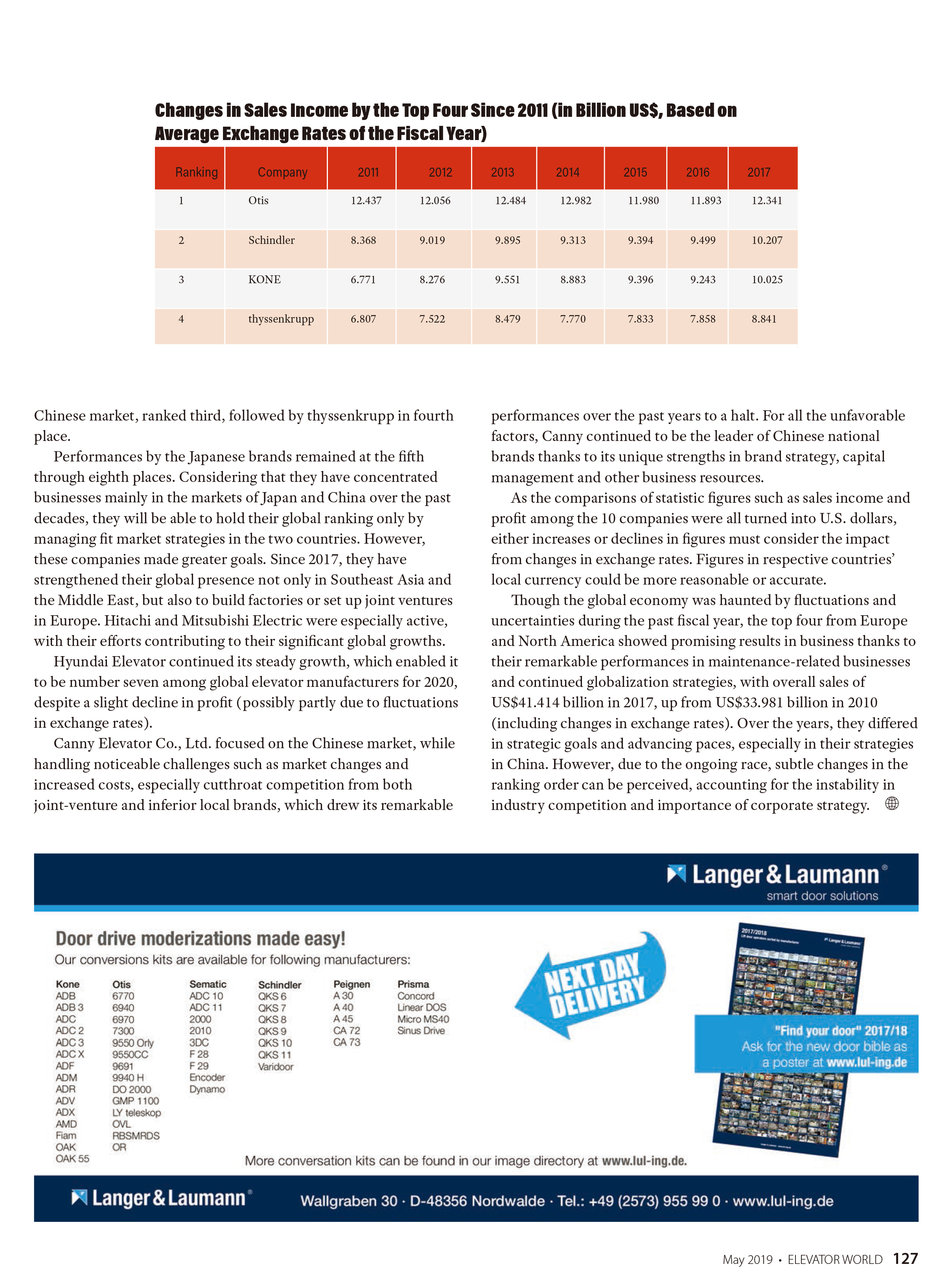 日前,最新出版《Elevator World》2019年5月刊权威发布《Global Top Ten Elevator Companies》文章,公司连续第2年跻身全球电梯制造商TOP10,是唯一位列全球前十的中国电梯品牌。